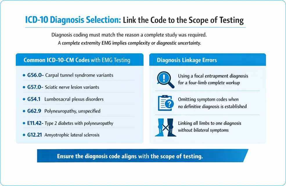 Diagnosis coding must match the reason a complete study was required. A complete extremity EMG implies complexity or diagnostic uncertainty that needs broad sampling.